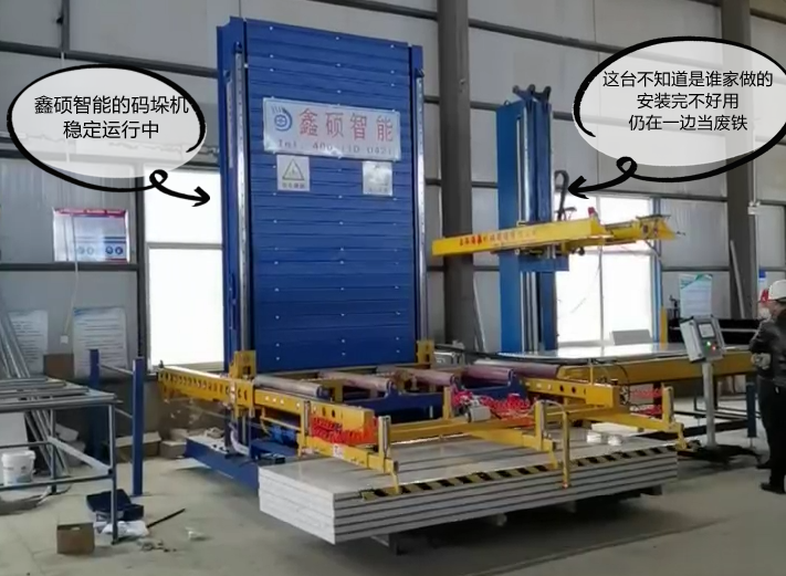 今日,山西客戶新定的兩臺彩鋼夾芯板碼垛機順利安裝調(diào)試并投入生產(chǎn)使用。此前該客戶于其他夾芯板碼垛機廠家定制一臺碼垛機設(shè)備,安裝之后始終問題不斷導致客戶無法正常使用,無奈之下只能仍在一邊。然后于遼寧鑫碩智能機械,定制3臺彩鋼夾芯板碼垛機器人。安裝調(diào)試之后,一直穩(wěn)定運行使用中??蛻艚o予鑫碩智能高度認可。